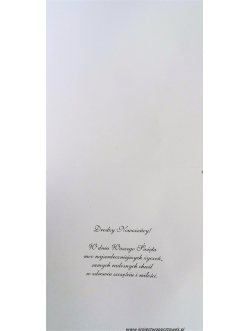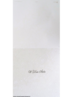 W Dniu Ślubu warto podarować nowożeńcom szczególną pamiątkę. Karnet, który proponujemy pomoże pamiętać im każdego dnia o miłości, którą przyrzekli sobie w tym szczególnym Dniu. Karnet wykonany jest z papieru w kolorze kremowym. Koperta ozdobiona jest szyfonową kokardą. W środku napisane są życzenia. Pierwsze zdjęcie przedstawia karnet w kopercie.
