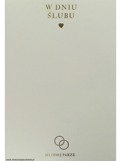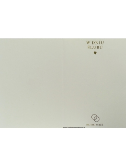 Elegancki karnet z napisanymi życzeniami z okazji Ślubu. Karnet składa się z dwóch części: jedna część to wycięta laserowo w finezyjne wzory okładka. Druga część to podwójna kartka z papieru w kolorze ciemno kremowym z wytłoczonym złotym napisem "W DNIU ŚLUBU MŁODEJ PARZE".