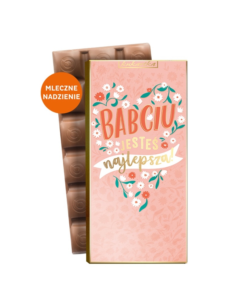 Czekolada to zawsze trafiony prezent to słodycz, której Babcia się nie oprze. Bo kto nie lubi czekolady? Dlatego właśnie będzie to idealny prezent dla każdej Babci, bez wyjątku. Podaruj BABCI czekoladę mleczną z mlecznym nadzieniem zamkniętą w niebanalnym opakowaniu. Czekolada z napisem na opakowaniu "BABCIU jesteś najlepsza". Wybierz czekoladę, która jest zdecydowanie wyjątkowym upominkiem nie tylko na "Dzień Babci".