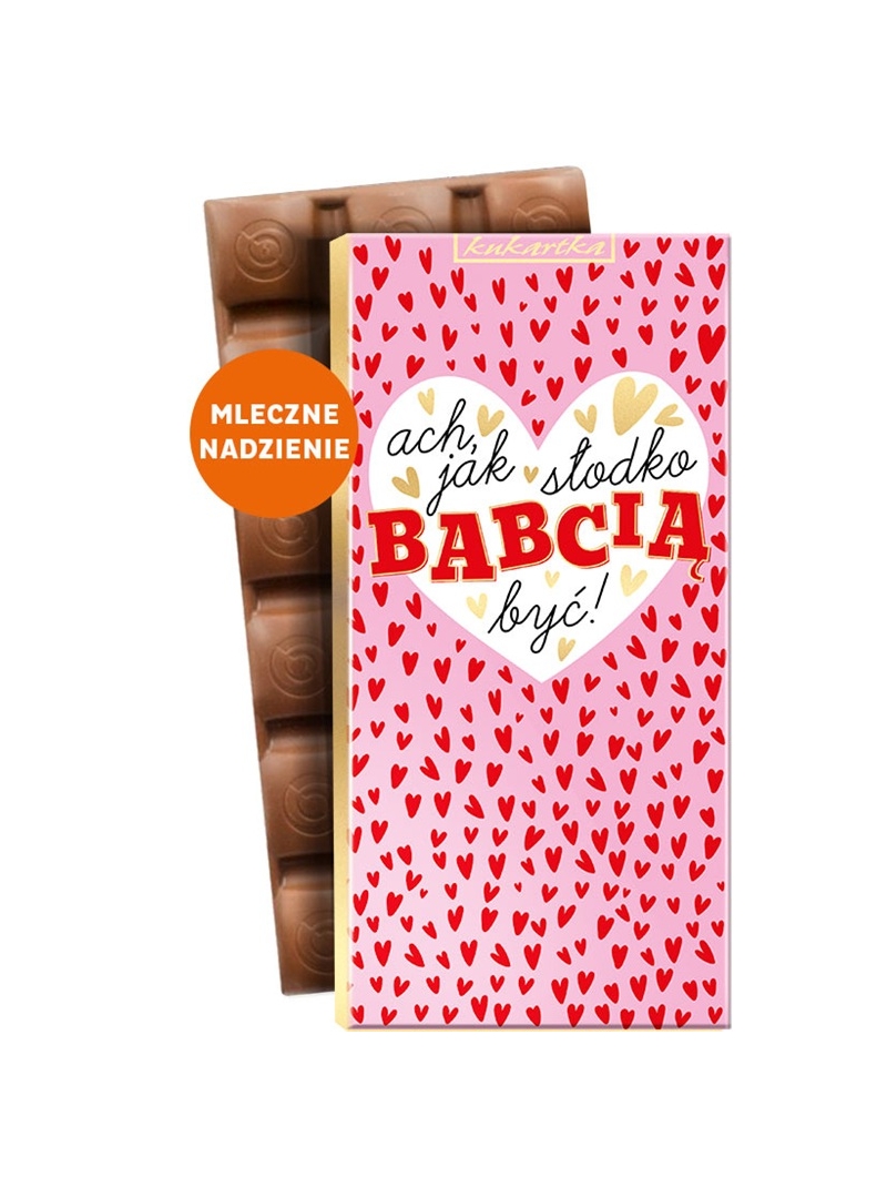 Czekolada to zawsze trafiony prezent to słodycz, której Babcia się nie oprze. Bo kto nie lubi czekolady? Dlatego właśnie będzie to idealny prezent dla każdej Babci, bez wyjątku. Podaruj BABCI czekoladę mleczną z mlecznym nadzieniem zamkniętą w niebanalnym opakowaniu. Czekolada z napisem na opakowaniu "ach, jak słodko BABCIA być!". Wybierz czekoladę, która jest zdecydowanie wyjątkowym upominkiem nie tylko na "Dzień Babci".