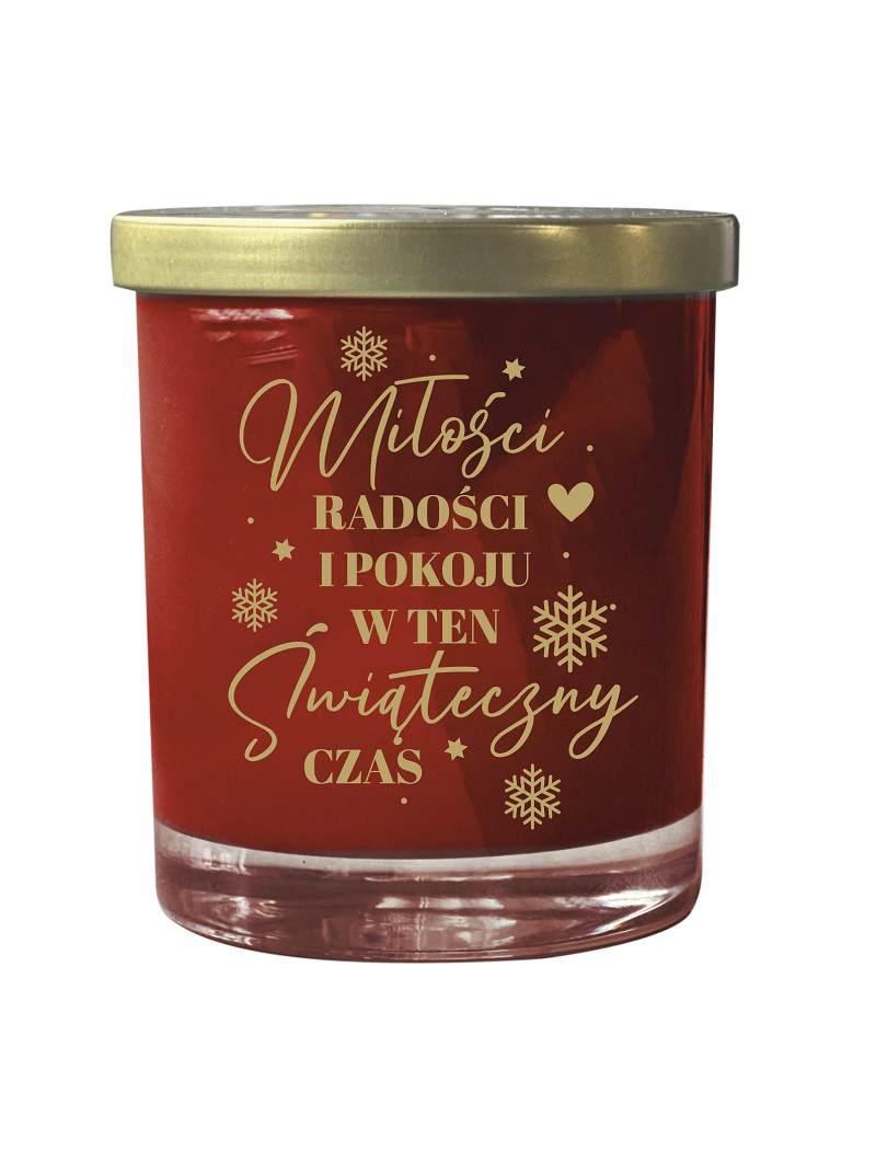 Świeca sojowa, zapachowa o zapachu „Grzanego wina” – to doskonały sposób na wprowadzenie świątecznej atmosfery w domu. Świeczka w szklanym, czerwonym opakowaniu ze złotym napisem - "Miłości, RADOŚCI I POKOJU W TEN Świąteczny Czas". Taka świeczka to idealny prezent na Boże Narodzenie. Świeca wykonana z wysokiej jakości wosku sojowego gwarantuje długi i równomierny czas palenia. Świeczka zawiera naturalny knot bawełniany i olejki eteryczne.